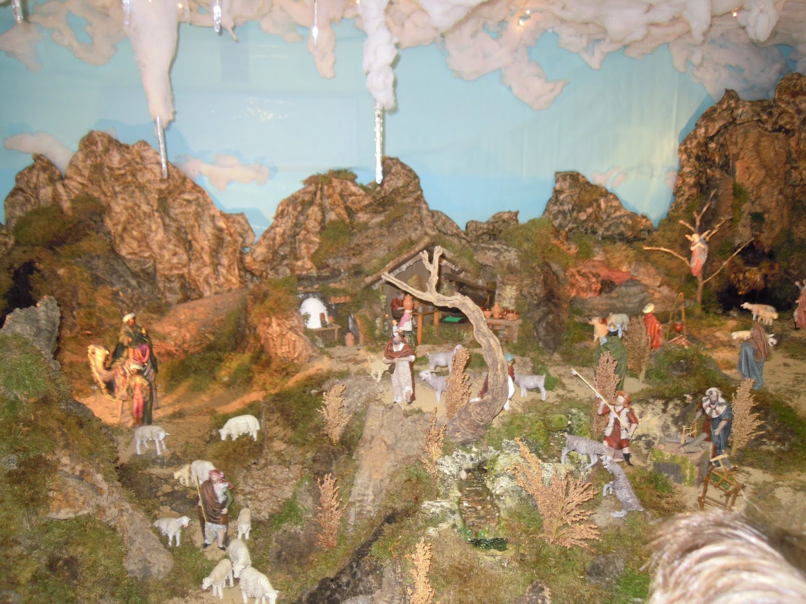 Aquest és el pessebre.Ara vos ho ensenyem amb detalls.Hi ha espardenyer,oller,forner,ferrer,pastors...No hi falta detall.
